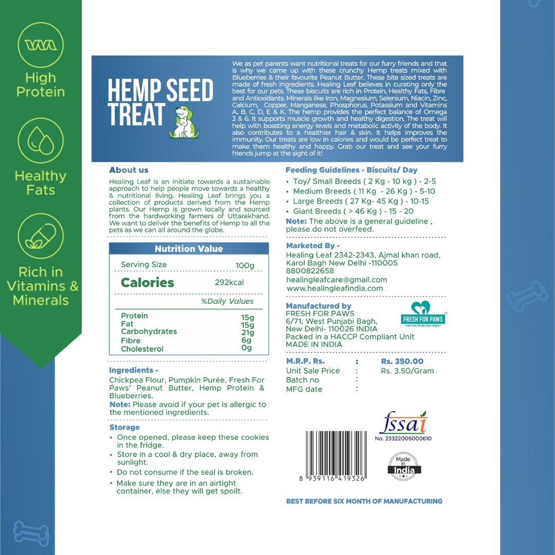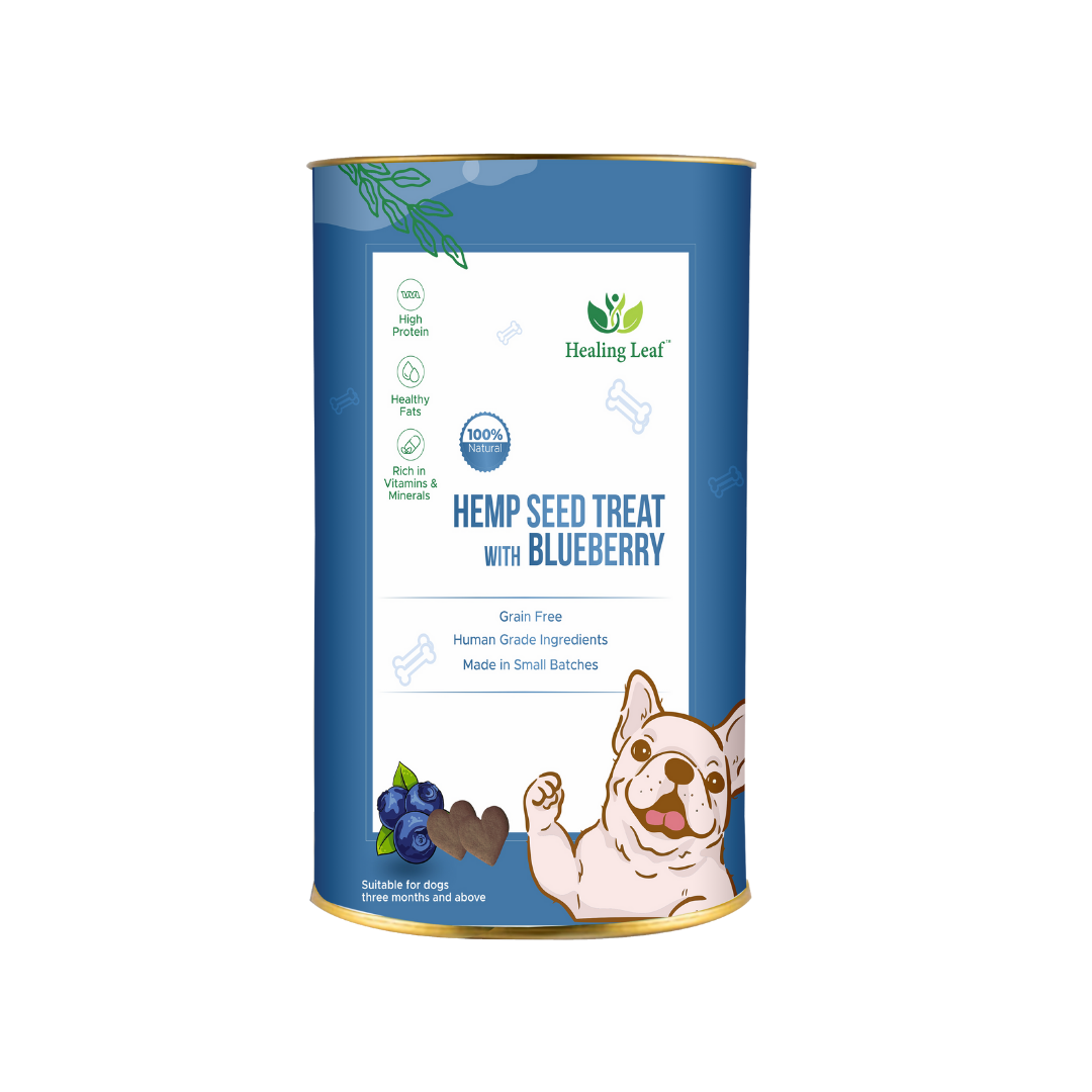 We as pet parents want nutritional treats for our furry friends and that is why we came up with these crunchy Hemp treats mixed with Blueberries & their favourite Peanut Butter. These bite sized treats are made of fresh ingredients. Healing Leaf believes in curating only the best for our pets. These biscuits are rich in Protein, Healthy Fats, Fibre and Antioxidants. Minerals like Iron, Magnesium, Selenium, Niacin, Zinc, Calcium, Copper, Manganese, Phosphorus, Potassium and Vitamins A, B, C, D, E & K. The hemp provides the perfect balance of Omega 3 & 6. It supports muscle growth and healthy digestion. The treat will help with boasting energy levels and metabolic activity of the body. It also contributes to a healthier hair & skin. It helps improves the immunity. Our treats are low in calories and would be perfect treat to make them healthy and happy. Grab our treat and see your furry friends jump at the sight of it!